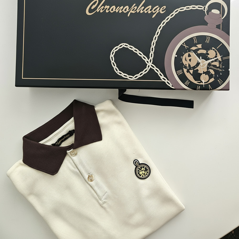 Le Polo Chronophage élève l’intemporel avec une maille jacquard 280 GSM d’une rare élégance. Sa coupe ajustée, ses boutons gravés et sa broderie signature reflètent l’exigence couture. Fabriqué au Portugal, il conjugue confort et sophistication pour une pièce d’exception.